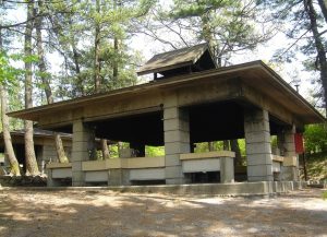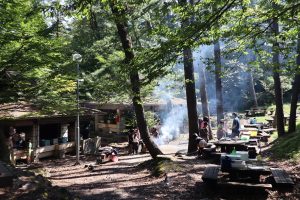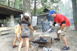ブナの自然林に囲まれた炊飯場は、25基のかまどが設置されており、一度に250人分の炊飯が可能です。